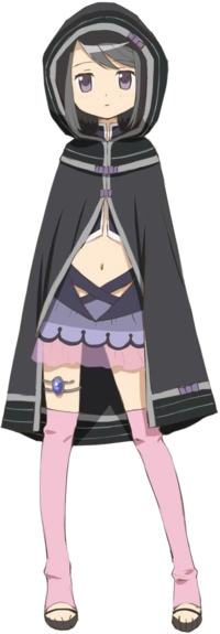 As a Magical Girl, Kuroe's outfit consists of a long black cloak with a hood and decorated with grey stripes, a sleeveless cropped top of the same which exposes her bellybutton, a double layered skirt, pink socks and black sandals. Kuroe also wears her Soul Gem around her right thigh. When in battle, she wields two identical purple scepters.